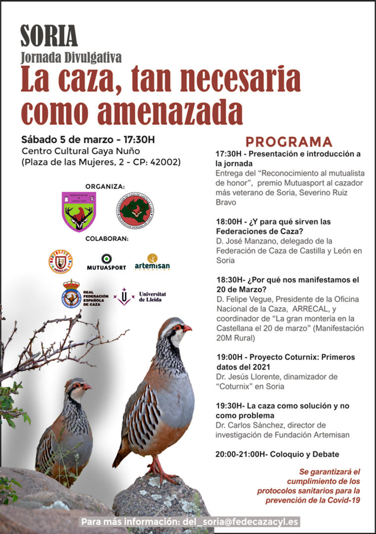 La delegación de Soria de la Federación de Caza de Castilla y León celebrará el próximo sábado, 5 de marzo, la jornada de divulgación “La caza, tan necesaria como amenazada”, un encuentro dirigido tanto a cazadores como al público general motivado por la celebración de la manifestación que tendrá lugar el domingo 20 de Marzo en Madrid, donde el objetivo será reivindicar unas condiciones más justas para el mundo rural y para el sector cinegético, en reconocimiento a su papel como actor fundamental para la economía de los pueblos y la conservación medioambiental.